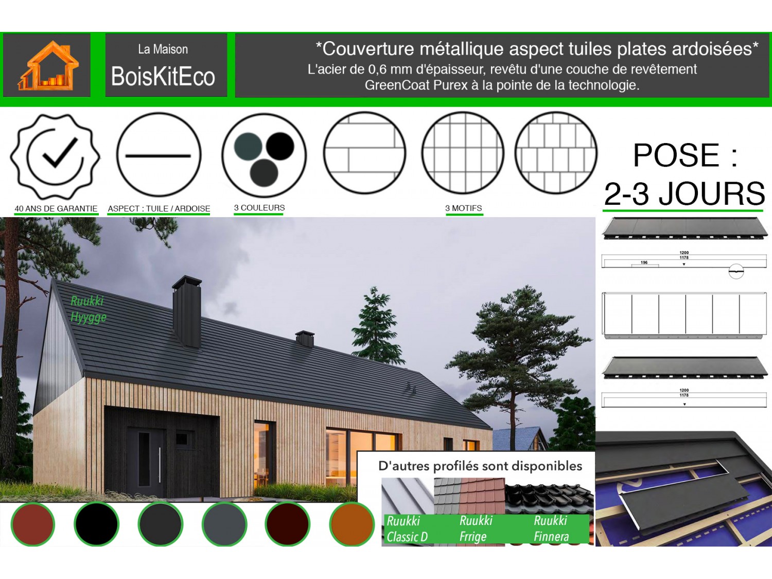 L'acier de 0,6 mm d'épaisseur est revêtu d'une couche de revêtement GreenCoat Purex à la pointe de la technologie